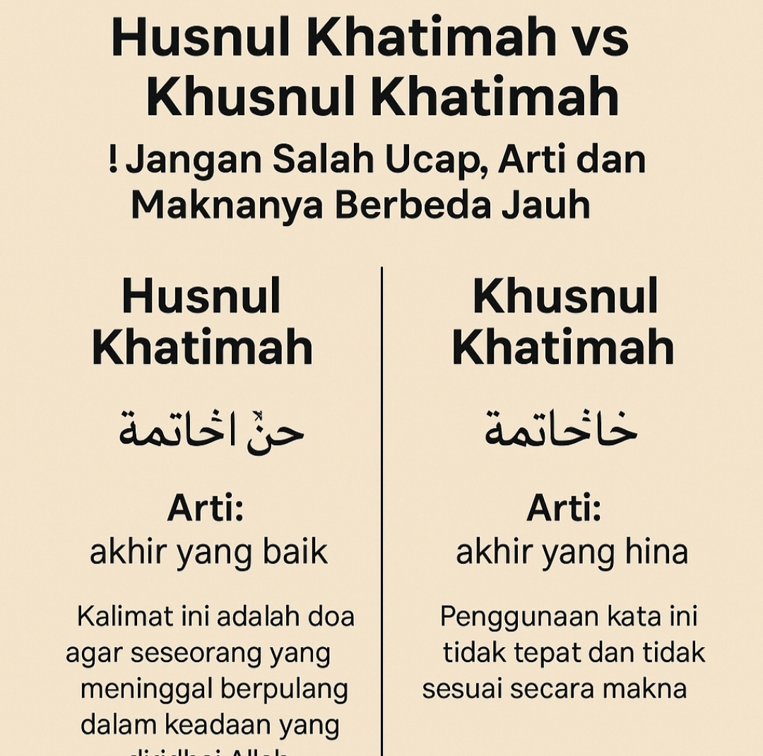 Berbeda dengan husnul khatimah, istilah “khusnul khatimah” sebenarnya tidak tepat secara ejaan maupun makna. Dalam penulisan Arab, tidak ada istilah “khusnul khatimah” yang sahih atau digunakan dalam literatur Islam.